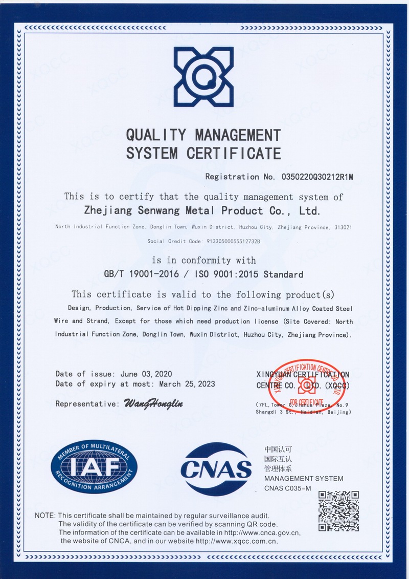 浙江森旺金屬制品有限公司成立于2012年,坐落湖州市吳興區東林鎮工業功能區。公司專業從事各類鍍鋅鋼絲、鋼絞線等產品的開發及生產。目前產品已廣泛應用于各類通信光電纜,電力輸送,電氣化鐵路工程,各類堤壩防護及農業溫室等工程領域。公司秉承“追求卓越品質,創建卓著信譽”的經營理念,始終堅持專業化、規?;慕洜I模式。